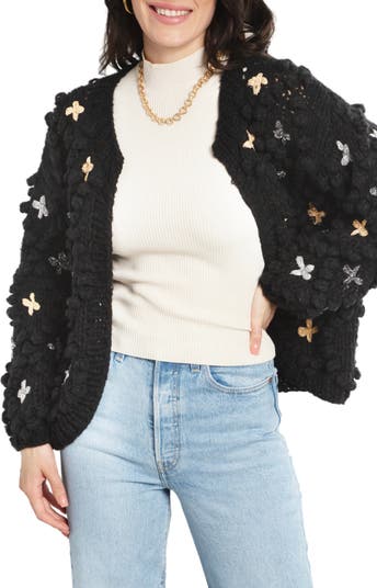 Metallic threaded accents give subtle shine to this crocheted cardigan that tops your look with a cozy vibe.