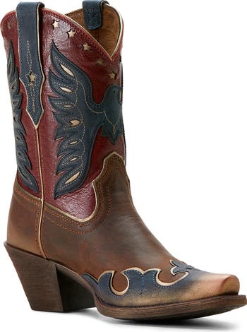 Americana-themed stitching shows off your patriotic spirit when you don this Western boot cut from soft, well-grained leather punctuated by star-shaped cutouts and framed by a stacked setback heel. A cushioned insole and lightweight, flexible construction enhance the easy-wearing appeal.