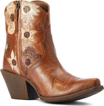 Embroidered flowers and textural fringe boost the eye-catching appeal of this snip-toe Western boot boasting ergonomic cushioning and a durable grip sole.