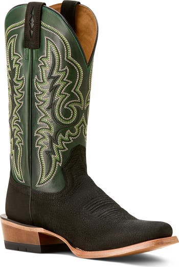 Ornate stitching and a curved topline distinguish a rugged Western boot grounded by a slip-resistant sole. Water-resistant leather and an ATS® shank provide stabilizing wear.