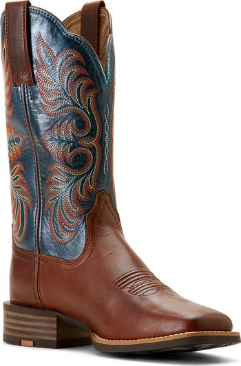 A traditional flame-stitched shaft in full-grain leather and a wide square toe bring a distinct Western look to this modern cowboy boot that offers all-day comfort and support with air-mesh lining and a flexible patterned sole.
