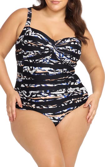 A twisted front, ruched detailing and powermesh lining flatter your figure in this one-piece swimsuit featuring multifit straps and full back coverage.