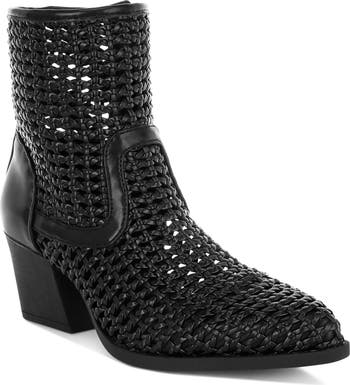 . footbedAn intricately woven shaft lends both texture and flair to this classic boot that sits on a stacked block heel and a cushioned