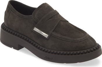 A sculptural, silvery accent lends a little flash to a workhorse loafer set atop a chunky rubber sole.
