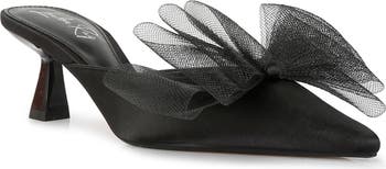 A netted bow amplifies the romance of an elegant satin mule framed by a chic pointed toe and walkable kitten heel.