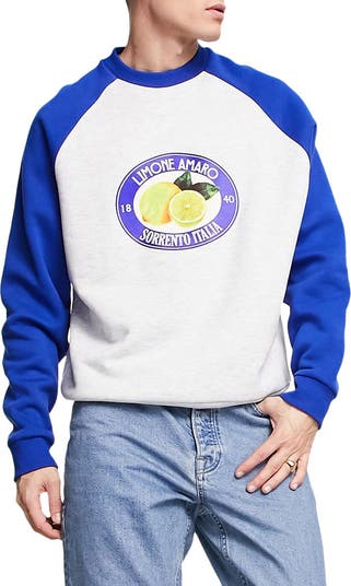 Color-blocked sleeves and an Italian lemon graphic bring fresh style to a raglan-sleeve sweatshirt in a casually oversized fit.