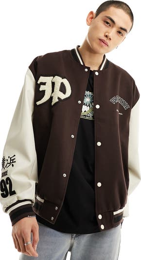 Add a classic varsity aesthetic to your wardrobe with this sporty bomber jacket cut in an oversized silhouette and detailed with tattoo-inspired patches. Faux-leather sleeves frame the woven body, lending rich texture to your look.