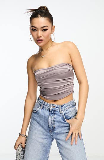 Put sass on the agenda with a strapless corset top cut from glossy satin.