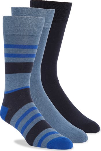 A mix of colors and patterns offer handsome options in a three-pack of dress socks made of a soft, stretchy knit.