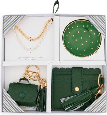Dual chain necklaces, a tray and two small pouches make up this assorted set that makes a wonderful gift for the fashionista in your life.