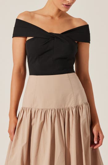 Bare a bit of skin in this chic, fitted top made with an off-the-shoulder neckline that highlights a twisted crossover design.