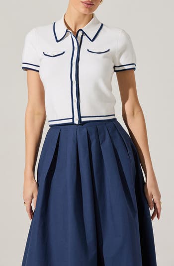 Turn up the charm in a wool-kissed cardi closed with pearly buttons and traced in contrast color.