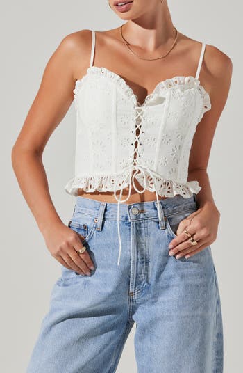 Bring a bit of vintage inspiration to your off-duty look with this crop top featuring ruffle trim, eyelet embroidery and corset-inspired lacing up the front.