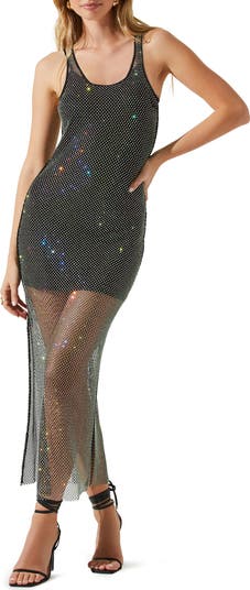 A sparkly rhinestone-embellished mesh overlay maximizes the modern glam of this sleeveless dress that's destined to stun on your next night out.