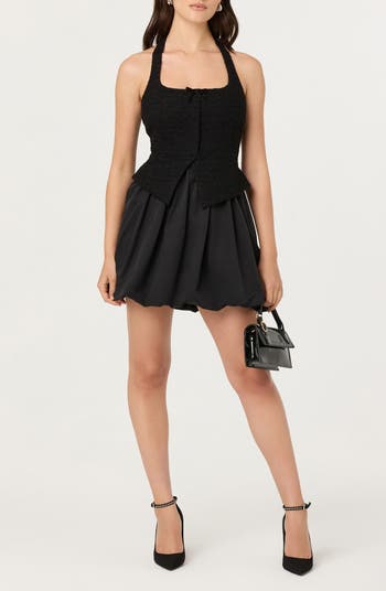 A tweed bodice and woven bubble skirt make this halter dress a contemporary style standout.
