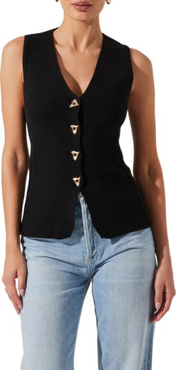 Statement buttons gleam on a waffle-textured-cotton sweater-vest designed in a trim, fitted silhouette that works well on its own.
