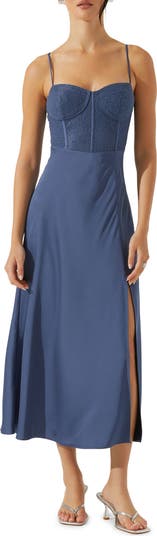 Steal the show in this sultry sleeveless midi designed with a lacy bustier bodice and a stem-showing vented skirt.