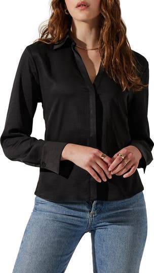 Elevate your your work-to-weekend wardrobe with a chic button-up blouse featuring a corset-inspired lace-up back design.
