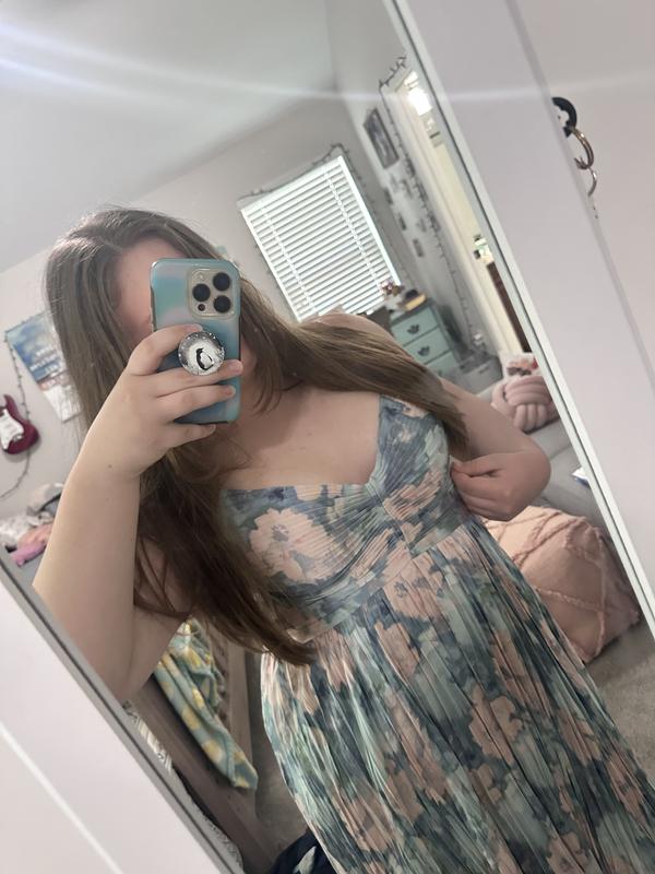 Dress flows beautifully. Love the adjustable straps and no bra required, just nipple covers. Although it’s pleated, it does wrinkle when packed for travel, but it’s not incredibly noticeable if you don’t steam it. Overall great cocktail dress, ideally suited for semi formal events. I wore a sweater as it was still chilly in April in the northeast. True to size, even at 18 weeks pregnant. It looked nice now and will still look nice once I’m no longer pregnant.