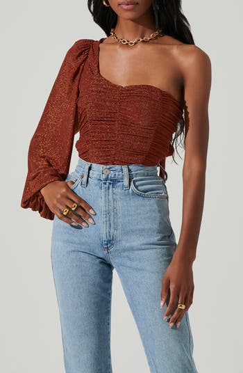 One billowy, drapey sleeve serves to emphasize the drama of this bare-shoulder top that's shaped with ruching at the bodice and dusted with metallic glitter.
