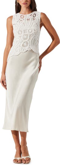 An intricate cotton-crochet bodice brings boho flair to this sleeveless midi dress made with a contrasting satin skirt.