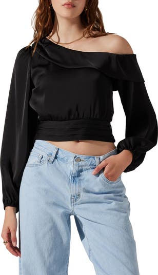 Show off some shoulder in this elegant satin blouse fashioned in a billowy silhouette with waist-cinching pleating at the hem