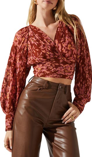 An abbreviated length lends modern style points to a woven top framed by blousy sleeves and done in an eye-catching print.