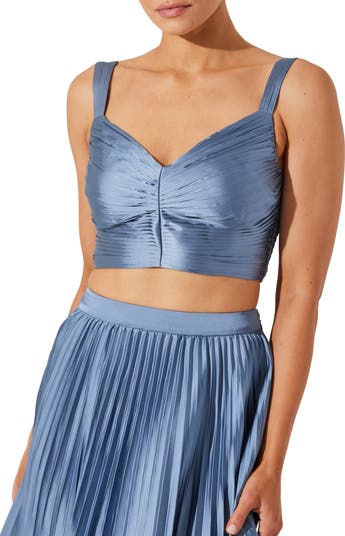 Allover pleating lends gorgeous texture to this flirty top cut from lustrous satin to a skin-showing cropped length.