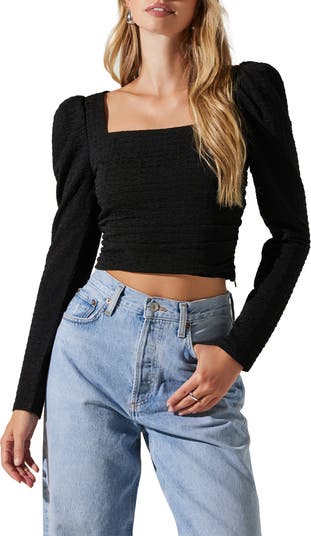 Puff shoulders frame this textured-knit crop top designed with a trendy square neckline.