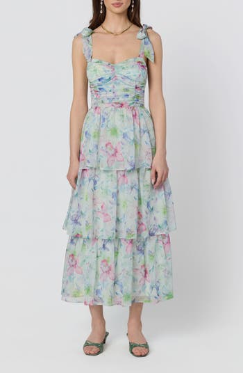A smocked back and ruched front bring intricate texture to the bodice of this tiered sundress sure to charm from garden parties to date nights.