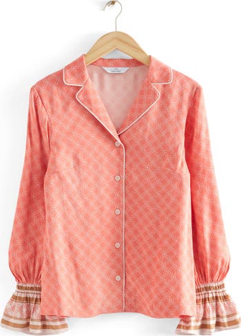 Classic tailored pajamas inspire a piped button-up shirt fashioned with ruffle cuffs for a dramatic look you'll want to wear out of the house.