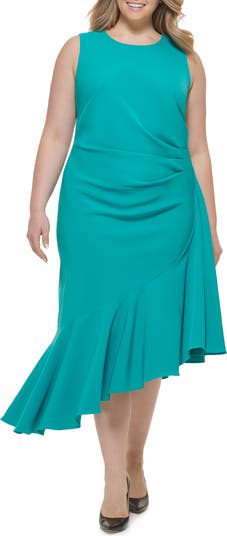 A ruffled asymmetric hem swishes and sways with your every move in this midi dress sure to delight from cocktail hour and beyond.