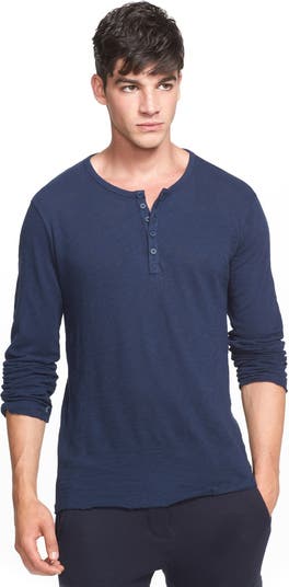 Raw edges relax the look of a luxurious five-button henley knit from fine slubbed cotton yarns.