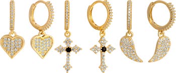 Pavé cubic zirconia bring stunning sparkle to this set of huggie hoop earrings suspending assorted charm drops.