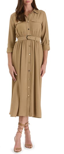 Gleaming button and a wide, removable waist belt add a polished finish to a maxi dress framed by long, roll-tab sleeves