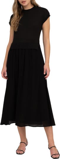 A ribbed-knit bodice tops a mixed-media dress edged by a woven skirt that flutes out with an elegant flourish.