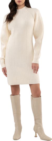 Show off cozy-chic style in this funnel-neck sweater-dress fashioned with gently puffed sleeves and directional ribbed stitches.