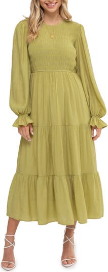 A long-sleeve midi dress offers charming style for any occasion with a smocked bodice, ruffled cuffs and flowy tiered silhouette.