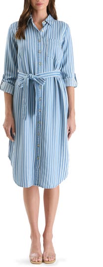 Breezy stripes adorn a chambray shirtdress that offers utility-inspired style with roll-tab sleeves, a self-tie belt and a curved hem.