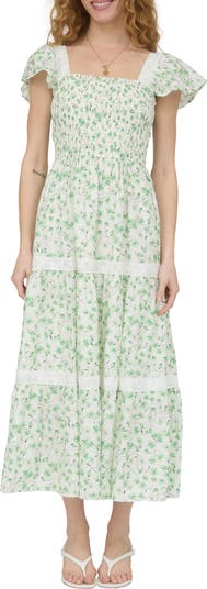 A square neck and flared, short sleeves add effortless charm to this midi dress that features a smocked bodice, tiered skirt and a fresh floral print.