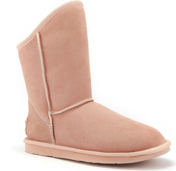 An angled topline puts a fresh spin on this cozy mid-calf boot lined with plush shearling.