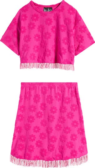 Let your kiddo lounge by the water in this jacquard cover-up set featuring fringey details along the hem of a crop top and a matching skirt.
