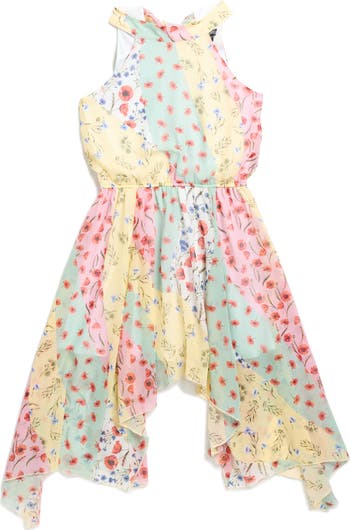 A mix of blooming patterns and pastel stripes bring springtime charm to a woven dress cut with an asymmetric length for twirl-worthy appeal.