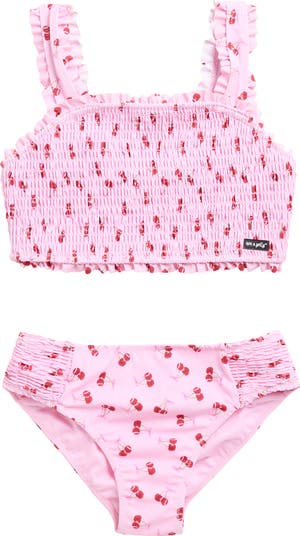 They'll love the fluttery ruffles outlining the edges of this smocked two-piece swimsuit.
