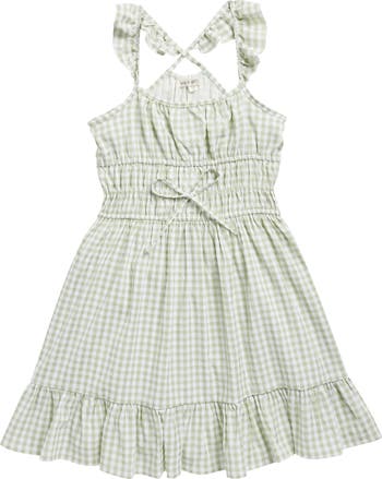 Frilly sleeves and a gathered waist adorned with a bow bring charm to this gingham dress made for days in the sun.