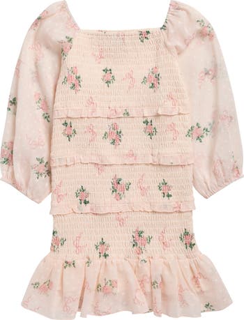 Swiss dot sleeves frame this kid-approved smocked dress adorned with a floral print and finished with a frilly hem.