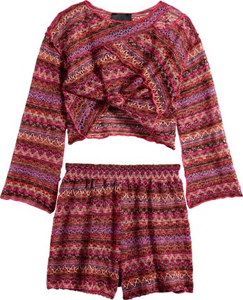 Crochet-inspired stitches give a lacy look to this matching set featuring a twist-front crop top and shorts, making it a perfect cover-up option that they'll love to lounge in.