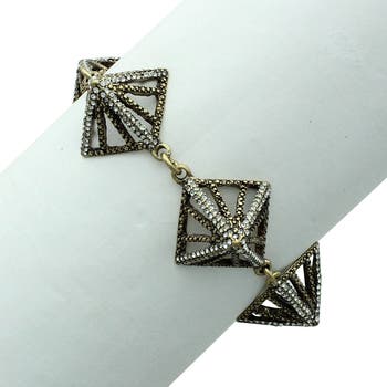 Crystals add sparkle to antiqued gold-tone cutout pyramids that create this unique geometric themed bracelet.