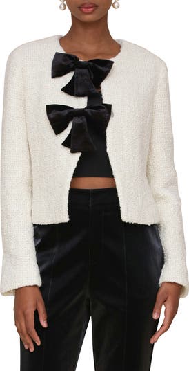 A duo of high-contrast bows channel the coquettish aesthetic on a charming cardigan fashioned at an abbreviated length for modern appeal.