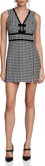 A duo of bows channel the coquettish aesthetic at the front of a stem-baring dress cut from classic black-and-white tweed.